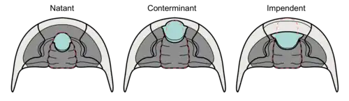 Hypostome morphology is highly variable; sometimes supported by an un-mineralised membrane (natant), sometimes fused onto the anterior doublure with an outline very similar to the glabella above (conterminant) or fused to the anterior doublure with an outline significantly different from the glabella (impendent). Many variations in shape and placement of the hypostome have been described.[59] The size of the glabella and the lateral fringe of the cephalon, together with hypostome variation, have been linked to different lifestyles, diets and specific ecological niches.[8]