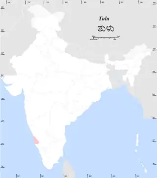 Tulu (Tulu Bāse, Tulu: [t̪uɭu baːsɛ])[lower-alpha 2] is a Dravidian language[6][7] whose speakers are concentrated in Dakshina Kannada and in the southern part of Udupi of Karnataka in south-western India[8] and also in the northern parts of the Kasaragod district of Kerala. The native speakers of Tulu are referred to as Tuluva or Tulu people and the geographical area is unofficially called Tulu Nadu.