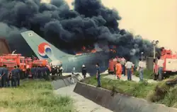 A Korean Air (KAL) Airbus A300, KAL 2033 skidded off the runway and exploded after trying to land on the island of Cheju, but all 160 aboard escaped without serious injury. The crew pushed the passengers down the escape chutes through the smoke and into the rain. The crash occurred shortly after 11 am when the pilot of flight 2033 from Seoul to Cheju, made a second attempt to land on the seaside runway in extremely powerful winds of up to 64 mph (103 km/h) and heavy rains. The Cheju medical clinic treated seven passengers and one crew member for minor injuries.[2]