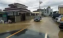 Record rainfall was observed in Aichi Prefecture, with 511 mm (20.1 in) of rain in Tokai and 532 mm (20.9 in) of rain in Nagoya in a span of a single day; both observations were the highest since records began in 1891. Due to the threat of landslides in Nagoya, the municipal government ordered the evacuation of 140,000 families. In the ward of Nakagawa-ku, two rivers overflowed their banks and over-topped the surrounding embankment.[11] Two tornadoes occurred in the prefecture, with one striking Mihama and another striking Minamichita; the former tornado injured 22 people, of which two were hospitalized.[24] Another 41,000 families encompassing 400,000 people were evacuated across Aichi, Gifu, and Mie prefectures as a precautionary measure.[15][25]