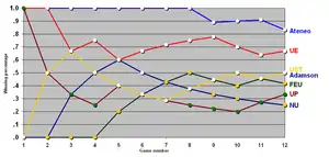 On the second round, UE was unbeaten, winning four straight (including the last game of the first round). However, UE was beaten by Adamson in an overtime thriller. After UST's victory of Adamson in the first game, UE is now assured of a twice-to-beat advantage at the semifinals.