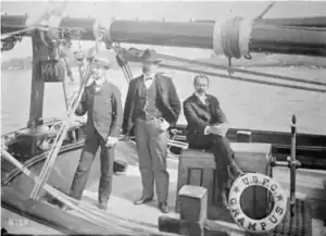 Grampus completed her cod collection duties off Massachusetts for the season in May 1890.[54] From 3 July to 25 August 1890, she resumed the work of recording water temperatures and weather off southern New England she had begun in the summer of 1889, this time joined in the effort by the United States Coast and Geodetic Survey survey steamer USC&GS George S. Blake and observers stationed aboard the Nantucket South Shoals Lightship.[52][53] Grampus again collected brood cod over the winter of 1890–1891.[55] From 5 May to 18 June 1891, she again investigated the mackerel fishery off the U.S. East Coast between Massachusetts and Delaware, continuing the inquiry into how weather and water temperature influenced the seasonal movements of mackerel.[56] Following that, she operated off southern New England for the third consecutive summer, from 30 June to 1 September 1891, to continue the study of vertical water columns and weather begun in 1889, this time operating only with the support of personnel embarked on the lightship.[57][58] On 5 September 1891, Grampus was on a voyage from Hyannis, Massachusetts, to Woods Hole with U.S. Commissioner of Fisheries Marshall McDonald and his wife and daughter, Assistant U.S. Fish Commissioner J. W. Collins (her former captain), and two female guests aboard when she ran aground on L'Hommidieu Shoal in Vineyard Sound during a southeasterly storm. McDonald, Collins, McDonald's family members, and the other two women made it safely to Falmouth, Massachusetts, in a dory, and Grampus later was refloated and returned to service.[59]