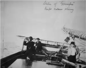 Grampus′s sail suit consisted of a foresail, a fore staysail, a riding sail, a mainsail, a jib, a flying jib, a fore gaff topsail, a main gaff topsail, a main topmast staysail, and a balloon jib.[19] She carried five boats: a 33-foot (10.1 m) carvel-built seiner rigged as a schooner;[20] a 17-foot (5.2 m) carvel-built open dinghy rigged as a sloop;[21] and three 19-foot-4-inch (5.9 m) dories.[22] She also carried three 13-foot (4.0 m) "live-cars," dory-like craft covered with heavy netting through which seawater could circulate freely. They were intended to keep fish alive after crew members manning the dories hauled in trawl lines; the men in the dories could dump the live fish into a live-car alongside each dory as they reeled in the lines.[23]