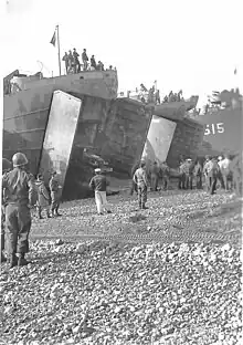 During World War II, LST-515 was assigned to the European Theater.[2] She was one of the eight LST's that took part in the disastrous "Exercise Tiger", a practice for the planned invasion of France, in April 1944. Under attack from German E-boats, LST-515 returned fire and lowered her boats to pick up survivors from LST-507.