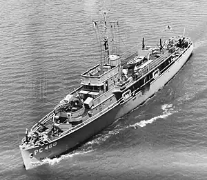 On 24 January 1942 in the Gulf of Panama about fourteen miles west of San Jose Light, PC-460 accidentally rammed and sank the submarine USS S-26. PC-460 was escorting S-26, USS S-29, and USS S-44 from the harbor of Balboa, Panama to their patrol stations when at 2210 the Sturdy sent a visual message to the submarines that she was leaving the formation and that they could proceed on the duty assigned.[1] S-21 was the only submarine to receive this message. Shortly thereafter, PC-460 struck S-26 on the starboard side of the torpedo room and the submarine sank within a few seconds.[1]
