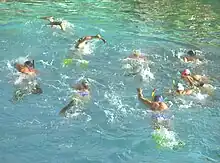Two teams of up to ten players compete, with six players in each team in play at any one time.[15] The remaining four players are continually substituted into play from a substitution area, which may be either on deck or in the water outside the playing area.