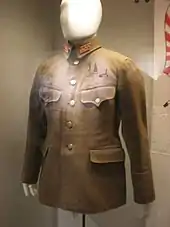 The Type 3 was introduced in 1943 and was similar to the Type 98 but was made of cheaper materials. Type 3 uniforms for enlisted men also consisted of only 3 size options compared to the 6 size options for the Type 98. Type 3 trousers were also cut lower down the waist and the fastening hook was replaced with a button top instead. It also reintroduced cuff insignias for officers consisting of 1, 2, or 3 stripes of dark-brown braid on or above the cuff to indicate company, field, or general officers' grades respectively. It was produced in various shades of green. Officers could wear the uniform tunic open over a white or light green shirt with or without a black or green tie.