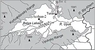 - 1 2 3 4 5 Glebova, A. B.; Chistyakov, K. V. (1 July 2016). "Landscape regularities of human colonization of the Tuva territory in the Scythian time (8th–3rd centuries B. C.)". Geography and Natural Resources. 37 (3): 239. doi:10.1134/S1875372816030070. ISSN 1875-371X.