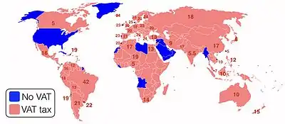 Not all localities require VAT to be charged, and exports are often exempt. VAT is usually implemented as a destination-based tax, where the tax rate is based on the location of the consumer and applied to the sales price. The terms VAT, GST, and the more general consumption tax are sometimes used interchangeably. VAT raises about a fifth of total tax revenues both worldwide and among the members of the Organisation for Economic Co-operation and Development (OECD).[1]:14 As of June 2023, 175[2] of the 193 countries with full UN membership employ a VAT, including all OECD members except the United States,[1]:14 where many states use a sales tax system instead.