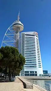 The Vasco da Gama Tower (Portuguese: Torre Vasco da Gama, pronounced [ˈtoʁɨ ˈvaʃku ðɐ ˈɣɐmɐ]) is a 145-metre (476 ft) lattice tower with skyscraper in the civil parish of Parque das Nações, the municipality of Lisbon, in Portugal. Built on the north bank of the Tagus river, it is named after the Portuguese explorer Vasco da Gama (the first European to arrive in India by sail, in 1498). The tower portion is the tallest structure in Lisbon.