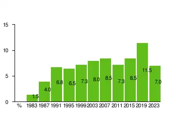 In 2003, the Green League received 8.0% of the vote, receiving a total of 14 seats. They increased their seats to 15 in the 2007 election while receiving 8.5% of the vote. In the 2011 election, the party lost five seats.