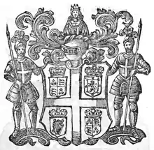 Two men in complete armor with their beavers (visors) open, on their helmets three ostrich feathers Argent, each charged on the breast with a cross throughout Gules, and each holding a lance proper in his exterior hand.