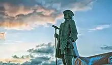 Vitus Bering was born in the port town of Horsens in Denmark to Anne Pedderdatter and her husband Jonas Svendsen (a "customs inspector and churchwarden") and was baptized in the Lutheran church there on 5 August 1681.[3] He was named after a maternal great-uncle, Vitus Pedersen Bering, who had been a chronicler in the royal court, and was not long deceased at the time of Vitus Jonassen Bering's birth. The family enjoyed reasonable financial security, with two of Vitus' elder half-brothers both attending the University of Copenhagen. Vitus however did not and instead signed on at age 15 as a ship's boy.[3] Between 1696 and 1704, Bering travelled the seas, reaching India and the Dutch East Indies while also finding time to complete naval officer training in Amsterdam.[3] He would also claim later (and, it seems, not without some supporting evidence) to have served on Danish whalers in the North Atlantic, visiting European colonies in the Caribbean and on the eastern seaboard of North America.[4] It was in Amsterdam, however, that in 1704 and under the guidance of Norwegian-born Russian admiral Cornelius Cruys, Bering gained an officer's commission into the Russian navy, with the rank of sub-lieutenant.[3] He would be repeatedly promoted in Peter the Great's rapidly evolving navy, reaching the rank of second captain by 1720. In that time, it appears he was not involved in any sea battles, but commanded several vessels on potentially dangerous missions, including the transport of a ship from the Azov Sea on Russia's southern coast to the Baltic on her northern coast.[3] His work in the latter stages of the Great Northern War (ending in 1721), for example, was dominated by lightering duties.[5]