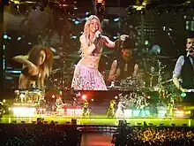 Shakira performing "Waka Waka (This Time for Africa)" during The Sun Comes Out World Tour in Madrid, Spain. The song peaked at number one in Spain for 17 consecutive weeks.[10]