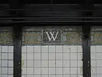 The single island platform is between the two tracks, and is very narrow compared to other stations in system. It has blue I-beam columns and dark blue floors tiles. The walls by the tracks have small "W" tablets on a mosaic trim except at the north end, where they have "WALL ST" written in black letters on white tablets over a green trim line. This is where the platform was extended in 1964–1965.[36] The platform also has cooling fans.[43]