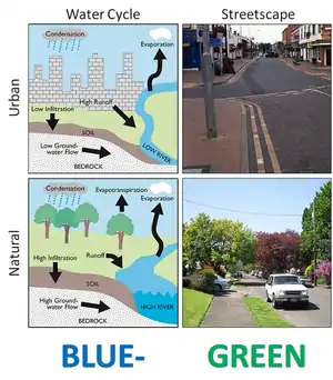 Water-sensitive urban design (WSUD) is a land planning and engineering design approach which integrates the urban water cycle, including stormwater, groundwater, and wastewater management and water supply, into urban design to minimise environmental degradation and improve aesthetic and recreational appeal.[1] WSUD is a term used in the Middle East and Australia and is similar to low-impact development (LID), a term used in the United States; and Sustainable Drainage System (SuDS), a term used in the United Kingdom.