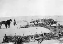 At 02.30 on 26 March, the regiment set out in thick fog for the assault on the town of Gaza. By 08:00 they had crossed the Wadi Ghuzze and reached Sheikh Abbas, confronted only by enemy aircraft and some Turkish camel patrols. Two hours later they were about three miles (4.8 km) to the east of Gaza, providing a guard force against any reinforcements that might approach from Hareira.[92] The British assault did not go according to plan, and at 14:00 the ANZAC Mounted Division was ordered to attack the town from the north. The regiment galloped forward together with the rest of the New Zealand brigade, and occupied Meshahera Ridge north-east of Gaza at 16:00. Dismounting, the regiment moved into Gaza, with the 6th Squadron leading, followed by the 2nd Squadron, and the 9th Squadron bringing up the rear.[93] At 16:25 they captured a Turkish field ambulance; four officers, 125 other ranks and twenty vehicles. Continuing the assault through artillery and small arms fire, the 2nd and 9th Squadrons reached a cactus hedge. Cutting through it with their bayonets, they engaged the Turkish defenders behind it in hand-to-hand fighting. Two troops then charged across a lagoon, about 18 inches (460 mm) deep, to capture a Turkish trench. To their right they sighted a Turkish artillery emplacement, and Meldrum ordered the position taken without delay. Two troops from the 2nd and one from the 9th Squadron carried out a bayonet charge and captured the guns intact.[94] Back in the regiment's centre they were held up by a strong Turkish defensive position at a cemetery. Instead of trying to attack the position, they held their line while the captured guns were recovered. The regiment was now some distance in front of the 2nd Light Horse Brigade to their left, and in danger of a flanking counter-attack. To assist the defence of their position, they turned one of the captured guns onto the Turkish strong points, the inexperienced gun crew sighting by peering down the barrel until they could see their target.[95]