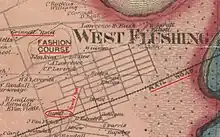 Three blocks east of Corona station was another station named West Flushing that served the community at large. It was located at what is today 108th Street and 44th Avenue, and was built in September 1854.[3][1] Though even the most scholarly railroad historians never knew when the station was closed, it may have been related to the purchase of the New York and Flushing Railroad by the Flushing and North Side Railroad, if not then the 1869 closure of the horse racing track served by Corona station. A December 31, 1869 timetable refers to a "West Flushing" station, but it is unknown whether it refers to the original station or not.[5][6]