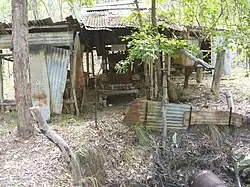 The mines are connected by a skid path to a small battery shed and living quarters. The battery shed is constructed of bush timber clad with corrugated iron. The shed contains a vertical boiler and semi- portable engine, a light three-head prospecting battery, a workshop, a living area and fireplace, and a small water tank on a recently collapsed timber stand. A caved water shaft and a stone forge are located alongside the shed. A small watercourse which runs past the battery contains three stone overshot weirs.[1]