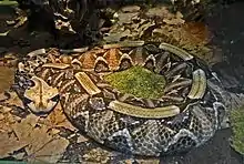 The Nile crocodile and the dwarf crocodile occur in the coastal mangrove swamps but are rare, while the West African crocodile occurs further inland and is relatively common.[2] There are a wide variety of lizards, chameleons, geckos and snakes, including Bitis rhinoceros, a venomous viper endemic to West Africa, slender tree snakes that feed on birds and their eggs, and blind snakes in the genus Typhlops. Six species of turtle are found in Liberia, three marine and three freshwater, although one of the latter, the forest hinge-back tortoise is largely terrestrial.[13]