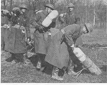 The Livens Projector was used in a series of gas attacks during October 1916 and a number of officers took a close interest in the results. Livens had witnessed some projector firings from the vantage of an aircraft and in his report he estimated that "...if the projectors were used on a large scale the cost of killing Germans could be reduced to sixteen shillings [that is £0.80[lower-alpha 3]] each."[31] This report was sent to the Ministry of Munitions and Livens was returned to England soon afterwards to help develop a standard projector and drum. The Livens Projector became a preferred means by which the British Army delivered a chemical attack and its production was given a high priority, the total for the Allies of the Great War eventually exceeded 150,000 units.[2] Livens, "who was always full of ideas" gave up the command of Z company and became a liaison officer between Foulkes' Special Brigade and the Ministry of Munitions in which role he remained for the last two years of the war.[32]
