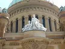 Standing upon a raised pedestal in the centre is a female figure lightly draped in flowing robes, representing the "Guardian Genius of the City", with the symbol of Wisdom in one hand and Justice in the other. She is crowned with the civic crown and waratah wreath. At her feet is a shield bearing the city crest. On her right is seated a semi-nude, muscular, male figure, representing Labor and Industry, with the appropriate symbols, viz., wheat, a ram, fruit, and a beehive, grouped round him. On her left is a corresponding male figure representing Commerce and Exchange. A ship in full sail is shown on his left. A bag of money its in one of his hands, and the ledger book in the other. Both figures are wreathed with olive, the symbol of Peace.[4]