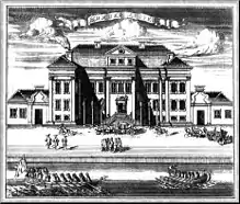 The first Winter Palace was a modest building of two main floors under a slate roof.[12] It seems that Peter soon tired of the first palace, for in 1721 the second version of the Winter Palace was built under the direction of architect Georg Mattarnovy. Mattarnovy's palace, though still very modest compared to royal palaces in other European capitals, was on two floors above a rusticated ground floor, with a central projection underneath a pediment supported by columns.[13] It was here that Peter the Great died in 1725.