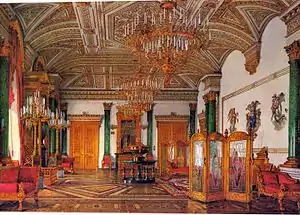 While some aspects of this manic collecting could have been a manifestation of Catherine's desire for a recognition of her intellectual concepts,[32] there was also a more fundamental motivation: necessity. Just twenty years earlier, so scarce were the furnishings of the Imperial palaces that bedsteads, mirrors, tables and chairs had to be conveyed between Moscow and Saint Petersburg each time the court moved.[33]