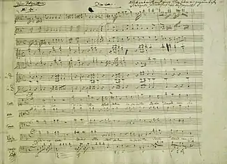 Mozart's last year was, until his final illness struck, a time of high productivity—and by some accounts, one of personal recovery.[79][lower-alpha 8] He composed a great deal, including some of his most admired works: the opera The Magic Flute; the final piano concerto (K. 595 in B); the Clarinet Concerto K. 622; the last in his series of string quintets (K. 614 in E); the motet Ave verum corpus K. 618; and the unfinished Requiem K. 626.