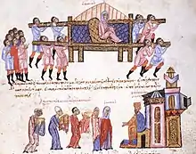 The Roman right to actual divorce was gradually erased after the introduction of Christianity and replaced with legal separation and annulation. In the Byzantine Empire marriage was regarded as the ideal state for a woman, and only convent life was seen as a legitimate alternative. Within marriage, sexual activity was regarded only as the means of reproduction. A woman had the right to appear before court, but her testimony was not regarded as equal to that of a man, and could be contradicted on the basis of her sex if put against that of a man.[2] On the other hand, women were not entirely subordinated to the will of men. According to the Early Byzantine diplomat and political thinker Priscus of Pannion, '[a]mongst the Romans it was not right to betroth a woman to a man against her will'.[4] Theodore of Sykeon in his Life 'depicts a household of strong women, with no male head, who converge to spoil and promote the one young male child in the family. The women have some choice in their lives, they are able to make a living through the proceeds of the inn, and later, Theodore's grandmother chooses the religious life while his mother marries into a prominent family.'[5]