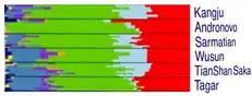 A genetic study published in Nature in May 2018 examined the remains of four Wusun buried between ca. 300 BC and 100 BC. The sample of Y-DNA extracted belonged to haplogroup R1. The samples of mtDNA extracted belonged to C4a1, HV6, J1c5a and U5b2c. The authors of the study found that the Wusun and Kangju had less East Asian admixture than the Xiongnu and the Saka. Both the Wusun and Kangju were suggested to be descended from Western Steppe Herders (WSHs) of the Late Bronze Age who admixed with Siberian hunter-gatherers and peoples related to the Bactria–Margiana Archaeological Complex.[66]