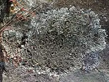 Xanthoparmelia conspersa has a thallus that is either tightly or loosely attached to its substrate. The thallus, which measures 4–12 cm (1.6–4.7 in), is made of narrow lobes that are 1–3 mm wide, which are crowded and usually overlapping. The thallus upper surface often features isidia that range in shape from spherical to branched cylinders. The lower surface of the thallus is black, except for near the lobe tips, where it may be pale to dark brown.[4] Rhizines are coarse, black, and simple (i.e., unbranched), with a length of 0.5–1 mm. Ascospores are 5–6 by 9–10 μm.[5]