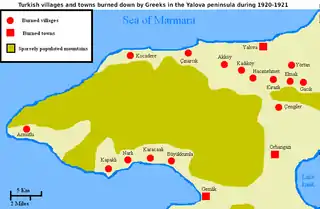 The Yalova Peninsula massacres were a series of massacres during 1920–1921, the majority of which occurred during March – May 1921. They were committed by local Greek and Armenian bands with the invading Hellenic Army,[1][6] against the Turkish Muslim population of the Yalova Peninsula.[6] There were 27 villages burned and in Armutlu.[1] According to journalist Arnold J. Toynbee c. 300 Muslims were killed during April–July 1921.[2] In an Ottoman inquiry of 177 survivors in Constantinople, the number of victims reported was very low (35), which is in line with Toynbee's descriptions that villagers fled after one to two murders.[9] Moreover, approximately 1,500 out of 7,000 Muslims remained in the region after the events[3] or 6,000 had left Yalova where 16 villages had been burned.[4] On the other hand, Ottoman and Turkish documents on massacres claim that at least 9,100 Muslim Turks were killed.[10]