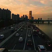 Olympic-daero (also known as Olympic Boulevard) runs alongside the south bank of the Han River and through Yeongdeungpo District. Construction of the road began in 1982 and was completed in 1986. The eight-lane highway is 40.67 km (25.27 mi) long and connects Yeongdeungpo with Incheon and Gimpo international airports as well as Gangnam and Songpa in the east.