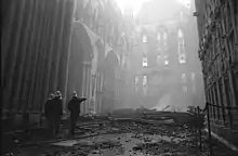 On 9 July 1984, York Minster suffered a serious fire in its south transept during the early morning hours.[20] Firefighters made a decision to deliberately collapse the roof of the south transept by pouring tens of thousands of gallons of water onto it, in order to save the rest of the building from destruction.[21] A total of 114 firefighters from across North Yorkshire responded to the fire and contained it,[20] while York Minster's staff and clergy rushed to preserve historical objects in the building.[20] The glass of the south transept rose window was shattered by the heat but the lead held it together, allowing it to be taken down for restoration.[22][21] A subsequent investigation found an 80% chance that the fire was caused by a lightning strike to a metal electrical box atop the roof, a 10% chance that the fire was caused by arson, and a 10% chance that the fire was caused by an electrical fault.[20] Some traditionalist Anglicans suggested the fire was a sign of divine displeasure at the recent consecration as Bishop of Durham of David Jenkins, whose views they considered heterodox.[23]