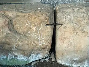 One of the most striking features of the tomb is the presence of carved symbols on the slabs inside the chamber.[8] Lines are formed of rows of individual punched dots, possibly applied with a very early metal tool. One of the more common symbols is a simple line with an attached open semicircle, usually interpreted as a stylised depiction of cattle. Normally, two of these symbols are linked by a further line with emphasised terminals. This may be a simple depiction of a plough. More rarely, two of them are linked by what resembles a yoke and pole, suggesting a cart. Occasionally overlapping signs suggest that the individual carvings are in no meaningful relationship to one another, but represent an accumulation of individual signs. Similar depiction of teams of cattle are known from much more recent (Bronze or Iron Age) carvings at Valcamonica near Capo di Ponte, Northern Italy and at Mont Bégo in the French part of the Ligurian Alps.[9] The symbols are normally assumed to reflect Neolithic ideological or religious ideas.[10]