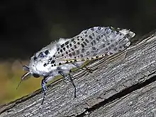 Zeuzera pyrina has a wingspan of 35–60 mm.[7] This is a highly distinctive species. The male is slightly smaller than the female. The length of the abdomen of the female is about 45–50 mm. These moths have a white head, with a black forehead and a very furry white thorax marked with six black spots. The abdomen is black, with short white hair-like scales on the posterior edge of each segment and a flat brush of scales on the apex. Forewings are whitish, long and narrow, with numerous black spots or black spots with white interior spots, arranged in rows along the veins. Hindwings are translucent, except in the anal area, with small black spots. In addition to the dimensions, the two sexes differ in the shape of the antennas, thinner in the female, while in the male they are markedly bipectinate, with the exception of terminals articles.