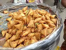- samosa: a snack of Indian origin, consisting of a deep-fried triangular turnover filled with vegetables (especially potatoes) or meat.