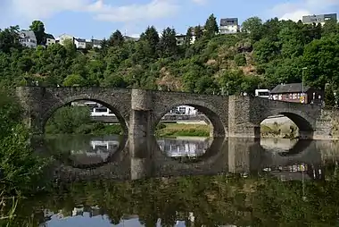 From Middle High German brucke, from Old High German brugga, brucca, from Proto-West Germanic *bruggju. The neurological sense “pons” is a semantic loan from Latin pōns.