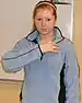 - Posture the dominant hand in the “open 8” handshape within a few inches from the chest, dominant palm facing back.