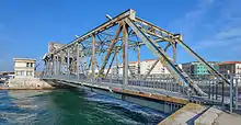 - A movable bridge consisting of one or two opening leaves equipped with balancing and stabilizing counterweights that ease and speed up their operation.