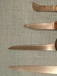 - The (typically sharp-edged) part of a knife, sword, razor, or other tool with which it cuts.