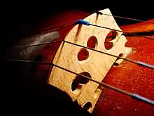 - (music, lutherie) The piece, on string instruments, that supports the strings from the sounding board.