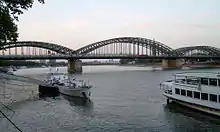 - (architecture) a bridge in which the horizontal deck is suspended from a reverse catenary to counteract bending