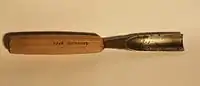 - A chisel with a curved blade for cutting or scooping channels, grooves, or holes in wood, stone, etc.