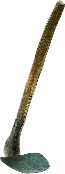- An agricultural tool consisting of a long handle with a flat blade fixed perpendicular to it at the end, used for digging rows.