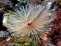 - Family Sabellidae [...] Head with a characteristic crown of 2 groups of pinnate projections called radioles [...], which sometimes bear eyes, and project from the tube when the worm is feeding.