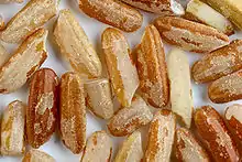 From Middle English rys, from Old French ris, from Old Italian riso, risi, from Byzantine Greek ὄρυζα (óruza), from an Eastern Iranian language related to Middle Persian blnc (*brinǰ), Northern Kurdish riz (beyond Euphrates) and Zazaki riz. Theorized to come to Iranian languages from Sanskrit व्रीहि (vrīhi).